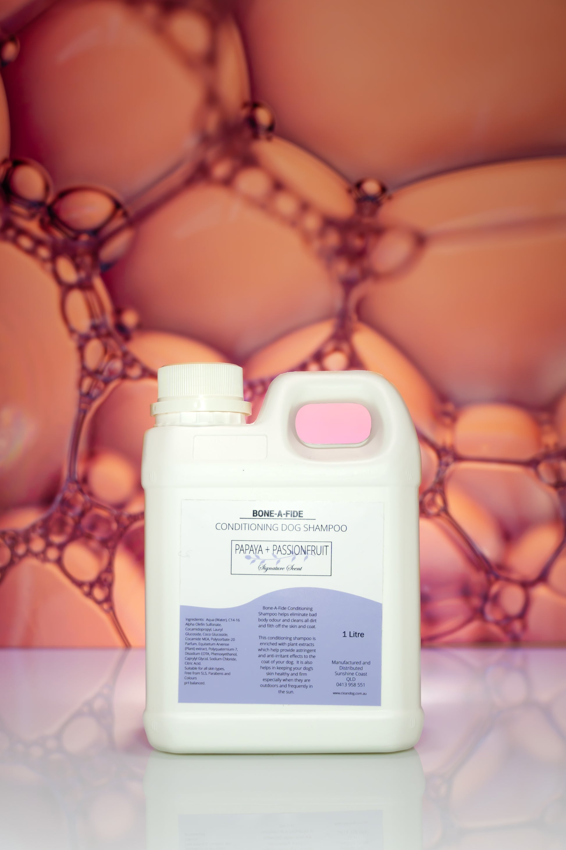 Bone-A-Fide Dog Shampoo is 100% non-toxic, stops odours and also has a blend of our signature scent Papaya + Passionfruit.